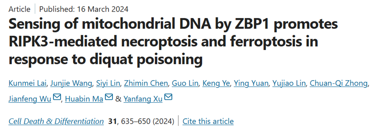 线粒体ROS启动的一系列事件包括线粒体功能障碍和随后线粒体DNA(mtDNA)释放到细胞质中。有证据表明,线粒体功能障碍、mtDNA不稳定性和程序性细胞死亡通路(如坏死性凋亡和铁死亡)之间存在关联。mtDNA缺乏自由的DNA末端,在复制和转录期间承受的扭转应变减少,在ROS的影响下,这可能促进其从B-DNA到Z-DNA结构的转变。ZBP1作为内源性Z-核酸的感受器,通过受体相互作用蛋白激酶3(RIPK3)依赖性磷酸化机制触发坏死性凋亡。可以想象,敌草快诱导的线粒体氧化应激可能促进Z-mtDNA的形成,最终激活ZBP1-RIPK3通路。